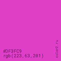 Цвет #DF3FC9 в цветовой модели RGB обозначается тремя октетами (223, 63, 201) в десятичном формате и #DF3FC9 в шестнадцатиричном (hex) формате, которые являются интенсивностью красного 223 (hex DF), интенсивность зелёного 63 (hex 3F) и интенсивность синего 201 (hex C9).
