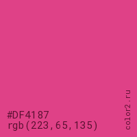 Цвет #DF4187 в цветовой модели RGB обозначается тремя октетами (223, 65, 135) в десятичном формате и #DF4187 в шестнадцатиричном (hex) формате, которые являются интенсивностью красного 223 (hex DF), интенсивность зелёного 65 (hex 41) и интенсивность синего 135 (hex 87).
