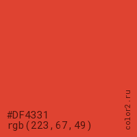 Цвет #DF4331 в цветовой модели RGB обозначается тремя октетами (223, 67, 49) в десятичном формате и #DF4331 в шестнадцатиричном (hex) формате, которые являются интенсивностью красного 223 (hex DF), интенсивность зелёного 67 (hex 43) и интенсивность синего 49 (hex 31).