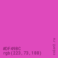 Цвет #DF49BC в цветовой модели RGB обозначается тремя октетами (223, 73, 188) в десятичном формате и #DF49BC в шестнадцатиричном (hex) формате, которые являются интенсивностью красного 223 (hex DF), интенсивность зелёного 73 (hex 49) и интенсивность синего 188 (hex BC).