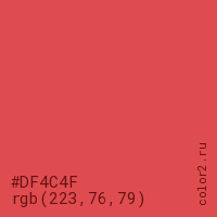 Цвет #DF4C4F в цветовой модели RGB обозначается тремя октетами (223, 76, 79) в десятичном формате и #DF4C4F в шестнадцатиричном (hex) формате, которые являются интенсивностью красного 223 (hex DF), интенсивность зелёного 76 (hex 4C) и интенсивность синего 79 (hex 4F).