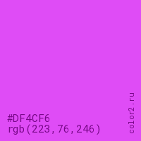 Цвет #DF4CF6 в цветовой модели RGB обозначается тремя октетами (223, 76, 246) в десятичном формате и #DF4CF6 в шестнадцатиричном (hex) формате, которые являются интенсивностью красного 223 (hex DF), интенсивность зелёного 76 (hex 4C) и интенсивность синего 246 (hex F6).