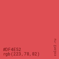 Цвет #DF4E52 в цветовой модели RGB обозначается тремя октетами (223, 78, 82) в десятичном формате и #DF4E52 в шестнадцатиричном (hex) формате, которые являются интенсивностью красного 223 (hex DF), интенсивность зелёного 78 (hex 4E) и интенсивность синего 82 (hex 52).