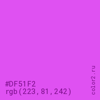 Цвет #DF51F2 в цветовой модели RGB обозначается тремя октетами (223, 81, 242) в десятичном формате и #DF51F2 в шестнадцатиричном (hex) формате, которые являются интенсивностью красного 223 (hex DF), интенсивность зелёного 81 (hex 51) и интенсивность синего 242 (hex F2).