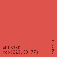 Цвет #DF534D в цветовой модели RGB обозначается тремя октетами (223, 83, 77) в десятичном формате и #DF534D в шестнадцатиричном (hex) формате, которые являются интенсивностью красного 223 (hex DF), интенсивность зелёного 83 (hex 53) и интенсивность синего 77 (hex 4D).