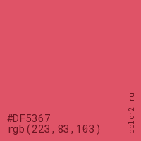 Цвет #DF5367 в цветовой модели RGB обозначается тремя октетами (223, 83, 103) в десятичном формате и #DF5367 в шестнадцатиричном (hex) формате, которые являются интенсивностью красного 223 (hex DF), интенсивность зелёного 83 (hex 53) и интенсивность синего 103 (hex 67).