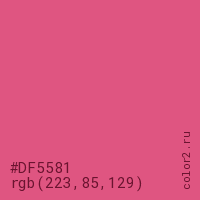 Цвет #DF5581 в цветовой модели RGB обозначается тремя октетами (223, 85, 129) в десятичном формате и #DF5581 в шестнадцатиричном (hex) формате, которые являются интенсивностью красного 223 (hex DF), интенсивность зелёного 85 (hex 55) и интенсивность синего 129 (hex 81).