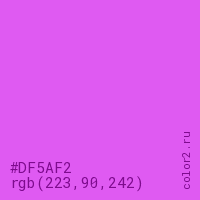 Цвет #DF5AF2 в цветовой модели RGB обозначается тремя октетами (223, 90, 242) в десятичном формате и #DF5AF2 в шестнадцатиричном (hex) формате, которые являются интенсивностью красного 223 (hex DF), интенсивность зелёного 90 (hex 5A) и интенсивность синего 242 (hex F2).