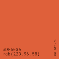 Цвет #DF603A в цветовой модели RGB обозначается тремя октетами (223, 96, 58) в десятичном формате и #DF603A в шестнадцатиричном (hex) формате, которые являются интенсивностью красного 223 (hex DF), интенсивность зелёного 96 (hex 60) и интенсивность синего 58 (hex 3A).