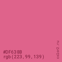 Цвет #DF638B в цветовой модели RGB обозначается тремя октетами (223, 99, 139) в десятичном формате и #DF638B в шестнадцатиричном (hex) формате, которые являются интенсивностью красного 223 (hex DF), интенсивность зелёного 99 (hex 63) и интенсивность синего 139 (hex 8B).