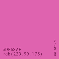Цвет #DF63AF в цветовой модели RGB обозначается тремя октетами (223, 99, 175) в десятичном формате и #DF63AF в шестнадцатиричном (hex) формате, которые являются интенсивностью красного 223 (hex DF), интенсивность зелёного 99 (hex 63) и интенсивность синего 175 (hex AF).