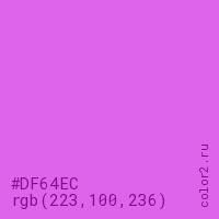 Цвет #DF64EC в цветовой модели RGB обозначается тремя октетами (223, 100, 236) в десятичном формате и #DF64EC в шестнадцатиричном (hex) формате, которые являются интенсивностью красного 223 (hex DF), интенсивность зелёного 100 (hex 64) и интенсивность синего 236 (hex EC).