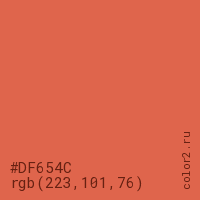 Цвет #DF654C в цветовой модели RGB обозначается тремя октетами (223, 101, 76) в десятичном формате и #DF654C в шестнадцатиричном (hex) формате, которые являются интенсивностью красного 223 (hex DF), интенсивность зелёного 101 (hex 65) и интенсивность синего 76 (hex 4C).
