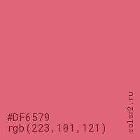 Цвет #DF6579 в цветовой модели RGB обозначается тремя октетами (223, 101, 121) в десятичном формате и #DF6579 в шестнадцатиричном (hex) формате, которые являются интенсивностью красного 223 (hex DF), интенсивность зелёного 101 (hex 65) и интенсивность синего 121 (hex 79).