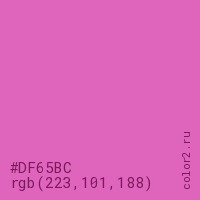 Цвет #DF65BC в цветовой модели RGB обозначается тремя октетами (223, 101, 188) в десятичном формате и #DF65BC в шестнадцатиричном (hex) формате, которые являются интенсивностью красного 223 (hex DF), интенсивность зелёного 101 (hex 65) и интенсивность синего 188 (hex BC).