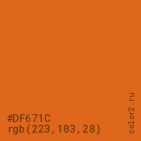 Цвет #DF671C в цветовой модели RGB обозначается тремя октетами (223, 103, 28) в десятичном формате и #DF671C в шестнадцатиричном (hex) формате, которые являются интенсивностью красного 223 (hex DF), интенсивность зелёного 103 (hex 67) и интенсивность синего 28 (hex 1C).