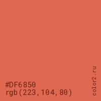 Цвет #DF6850 в цветовой модели RGB обозначается тремя октетами (223, 104, 80) в десятичном формате и #DF6850 в шестнадцатиричном (hex) формате, которые являются интенсивностью красного 223 (hex DF), интенсивность зелёного 104 (hex 68) и интенсивность синего 80 (hex 50).