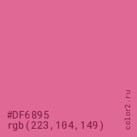 Цвет #DF6895 в цветовой модели RGB обозначается тремя октетами (223, 104, 149) в десятичном формате и #DF6895 в шестнадцатиричном (hex) формате, которые являются интенсивностью красного 223 (hex DF), интенсивность зелёного 104 (hex 68) и интенсивность синего 149 (hex 95).