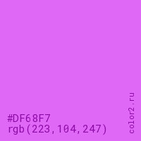 Цвет #DF68F7 в цветовой модели RGB обозначается тремя октетами (223, 104, 247) в десятичном формате и #DF68F7 в шестнадцатиричном (hex) формате, которые являются интенсивностью красного 223 (hex DF), интенсивность зелёного 104 (hex 68) и интенсивность синего 247 (hex F7).