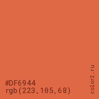 Цвет #DF6944 в цветовой модели RGB обозначается тремя октетами (223, 105, 68) в десятичном формате и #DF6944 в шестнадцатиричном (hex) формате, которые являются интенсивностью красного 223 (hex DF), интенсивность зелёного 105 (hex 69) и интенсивность синего 68 (hex 44).