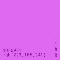 Цвет #DF69F1 в цветовой модели RGB обозначается тремя октетами (223, 105, 241) в десятичном формате и #DF69F1 в шестнадцатиричном (hex) формате, которые являются интенсивностью красного 223 (hex DF), интенсивность зелёного 105 (hex 69) и интенсивность синего 241 (hex F1).