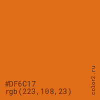 Цвет #DF6C17 в цветовой модели RGB обозначается тремя октетами (223, 108, 23) в десятичном формате и #DF6C17 в шестнадцатиричном (hex) формате, которые являются интенсивностью красного 223 (hex DF), интенсивность зелёного 108 (hex 6C) и интенсивность синего 23 (hex 17).
