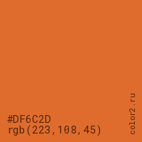 Цвет #DF6C2D в цветовой модели RGB обозначается тремя октетами (223, 108, 45) в десятичном формате и #DF6C2D в шестнадцатиричном (hex) формате, которые являются интенсивностью красного 223 (hex DF), интенсивность зелёного 108 (hex 6C) и интенсивность синего 45 (hex 2D).