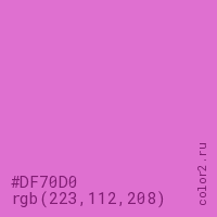 Цвет #DF70D0 в цветовой модели RGB обозначается тремя октетами (223, 112, 208) в десятичном формате и #DF70D0 в шестнадцатиричном (hex) формате, которые являются интенсивностью красного 223 (hex DF), интенсивность зелёного 112 (hex 70) и интенсивность синего 208 (hex D0).
