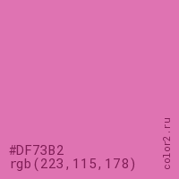 Цвет #DF73B2 в цветовой модели RGB обозначается тремя октетами (223, 115, 178) в десятичном формате и #DF73B2 в шестнадцатиричном (hex) формате, которые являются интенсивностью красного 223 (hex DF), интенсивность зелёного 115 (hex 73) и интенсивность синего 178 (hex B2).