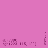 Цвет #DF73BC в цветовой модели RGB обозначается тремя октетами (223, 115, 188) в десятичном формате и #DF73BC в шестнадцатиричном (hex) формате, которые являются интенсивностью красного 223 (hex DF), интенсивность зелёного 115 (hex 73) и интенсивность синего 188 (hex BC).