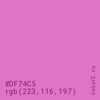 Цвет #DF74C5 в цветовой модели RGB обозначается тремя октетами (223, 116, 197) в десятичном формате и #DF74C5 в шестнадцатиричном (hex) формате, которые являются интенсивностью красного 223 (hex DF), интенсивность зелёного 116 (hex 74) и интенсивность синего 197 (hex C5).