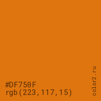 Цвет #DF750F в цветовой модели RGB обозначается тремя октетами (223, 117, 15) в десятичном формате и #DF750F в шестнадцатиричном (hex) формате, которые являются интенсивностью красного 223 (hex DF), интенсивность зелёного 117 (hex 75) и интенсивность синего 15 (hex 0F).