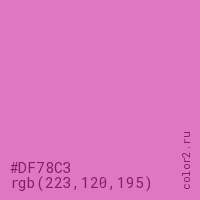 Цвет #DF78C3 в цветовой модели RGB обозначается тремя октетами (223, 120, 195) в десятичном формате и #DF78C3 в шестнадцатиричном (hex) формате, которые являются интенсивностью красного 223 (hex DF), интенсивность зелёного 120 (hex 78) и интенсивность синего 195 (hex C3).