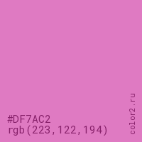 Цвет #DF7AC2 в цветовой модели RGB обозначается тремя октетами (223, 122, 194) в десятичном формате и #DF7AC2 в шестнадцатиричном (hex) формате, которые являются интенсивностью красного 223 (hex DF), интенсивность зелёного 122 (hex 7A) и интенсивность синего 194 (hex C2).