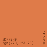Цвет #DF7B49 в цветовой модели RGB обозначается тремя октетами (223, 123, 73) в десятичном формате и #DF7B49 в шестнадцатиричном (hex) формате, которые являются интенсивностью красного 223 (hex DF), интенсивность зелёного 123 (hex 7B) и интенсивность синего 73 (hex 49).