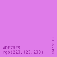 Цвет RGB(223, 123, 233) в процентом отношении количества цвета состоит из 87.5% красного (red), 48.2% зелёного (green) и 91.4% синего (blue).