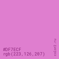 Цвет #DF7ECF в цветовой модели RGB обозначается тремя октетами (223, 126, 207) в десятичном формате и #DF7ECF в шестнадцатиричном (hex) формате, которые являются интенсивностью красного 223 (hex DF), интенсивность зелёного 126 (hex 7E) и интенсивность синего 207 (hex CF).