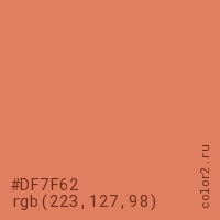 Цвет #DF7F62 в цветовой модели RGB обозначается тремя октетами (223, 127, 98) в десятичном формате и #DF7F62 в шестнадцатиричном (hex) формате, которые являются интенсивностью красного 223 (hex DF), интенсивность зелёного 127 (hex 7F) и интенсивность синего 98 (hex 62).