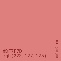Цвет #DF7F7D в цветовой модели RGB обозначается тремя октетами (223, 127, 125) в десятичном формате и #DF7F7D в шестнадцатиричном (hex) формате, которые являются интенсивностью красного 223 (hex DF), интенсивность зелёного 127 (hex 7F) и интенсивность синего 125 (hex 7D).