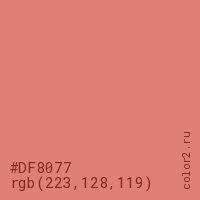 Цвет #DF8077 в цветовой модели RGB обозначается тремя октетами (223, 128, 119) в десятичном формате и #DF8077 в шестнадцатиричном (hex) формате, которые являются интенсивностью красного 223 (hex DF), интенсивность зелёного 128 (hex 80) и интенсивность синего 119 (hex 77).