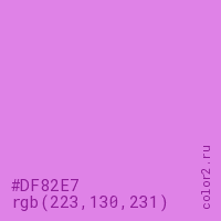 Цвет #DF82E7 в цветовой модели RGB обозначается тремя октетами (223, 130, 231) в десятичном формате и #DF82E7 в шестнадцатиричном (hex) формате, которые являются интенсивностью красного 223 (hex DF), интенсивность зелёного 130 (hex 82) и интенсивность синего 231 (hex E7).
