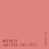 Цвет #DF837F в цветовой модели RGB обозначается тремя октетами (223, 131, 127) в десятичном формате и #DF837F в шестнадцатиричном (hex) формате, которые являются интенсивностью красного 223 (hex DF), интенсивность зелёного 131 (hex 83) и интенсивность синего 127 (hex 7F).