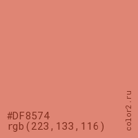 Цвет #DF8574 в цветовой модели RGB обозначается тремя октетами (223, 133, 116) в десятичном формате и #DF8574 в шестнадцатиричном (hex) формате, которые являются интенсивностью красного 223 (hex DF), интенсивность зелёного 133 (hex 85) и интенсивность синего 116 (hex 74).