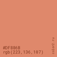 Цвет #DF886B в цветовой модели RGB обозначается тремя октетами (223, 136, 107) в десятичном формате и #DF886B в шестнадцатиричном (hex) формате, которые являются интенсивностью красного 223 (hex DF), интенсивность зелёного 136 (hex 88) и интенсивность синего 107 (hex 6B).