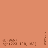 Цвет #DF8A67 в цветовой модели RGB обозначается тремя октетами (223, 138, 103) в десятичном формате и #DF8A67 в шестнадцатиричном (hex) формате, которые являются интенсивностью красного 223 (hex DF), интенсивность зелёного 138 (hex 8A) и интенсивность синего 103 (hex 67).