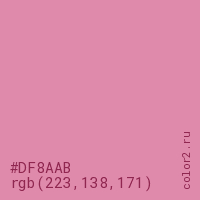 Цвет #DF8AAB в цветовой модели RGB обозначается тремя октетами (223, 138, 171) в десятичном формате и #DF8AAB в шестнадцатиричном (hex) формате, которые являются интенсивностью красного 223 (hex DF), интенсивность зелёного 138 (hex 8A) и интенсивность синего 171 (hex AB).