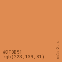 Цвет #DF8B51 в цветовой модели RGB обозначается тремя октетами (223, 139, 81) в десятичном формате и #DF8B51 в шестнадцатиричном (hex) формате, которые являются интенсивностью красного 223 (hex DF), интенсивность зелёного 139 (hex 8B) и интенсивность синего 81 (hex 51).