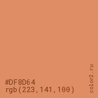 Цвет #DF8D64 в цветовой модели RGB обозначается тремя октетами (223, 141, 100) в десятичном формате и #DF8D64 в шестнадцатиричном (hex) формате, которые являются интенсивностью красного 223 (hex DF), интенсивность зелёного 141 (hex 8D) и интенсивность синего 100 (hex 64).