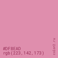 Цвет #DF8EAD в цветовой модели RGB обозначается тремя октетами (223, 142, 173) в десятичном формате и #DF8EAD в шестнадцатиричном (hex) формате, которые являются интенсивностью красного 223 (hex DF), интенсивность зелёного 142 (hex 8E) и интенсивность синего 173 (hex AD).
