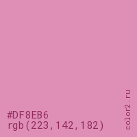 Цвет #DF8EB6 в цветовой модели RGB обозначается тремя октетами (223, 142, 182) в десятичном формате и #DF8EB6 в шестнадцатиричном (hex) формате, которые являются интенсивностью красного 223 (hex DF), интенсивность зелёного 142 (hex 8E) и интенсивность синего 182 (hex B6).